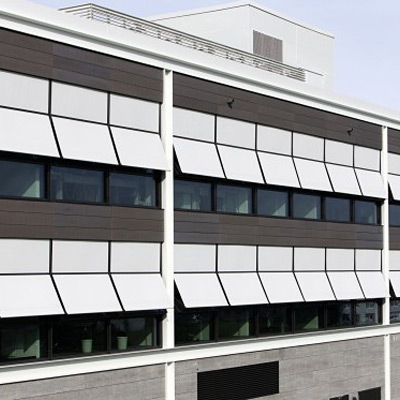 Markisoletten vereinen die Vorteile von Senkrecht- und Fallarmmarkisen und werden meist mit elektrischem Antrieb angeboten. Am häufigsten kommen sie an Geschäfts- und Mehrfamilienhäusern zum Einsatz.